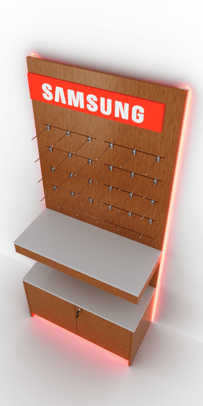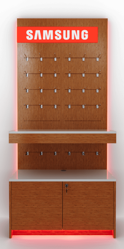 RED   – Zubehörwand mit  Unterschrank und Mittlere Ablage oben Logo Lightbox Beleuchtet